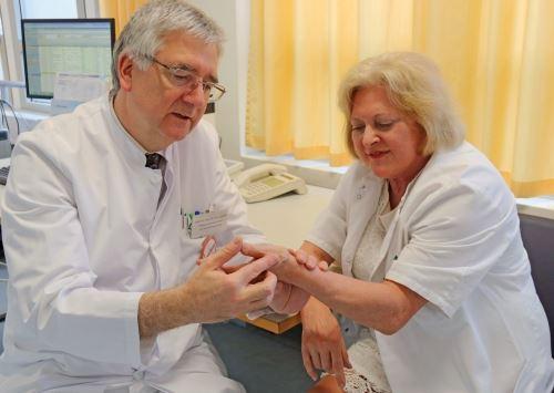 Schmerzfrei durch die neue Fett-Stammzellen Therapie: Dr. Marita Eisenmann-Klein, die Leiterin des neuen Kompetenzzentrums für "Regenerative Medizin", litt selbst unter schwerer Arthrose in den Daumensattelgelenken. Die Spezialistin für Plastische Chirurgie - hier mit Prof. Joachim Grifka, Direktor der Orthopädischen Universitätsklinik - ist seit der Stammzellen-Injektion vor zehn Monaten schmerzfrei. Foto: Asklepios Klinikum Bad Abbach
