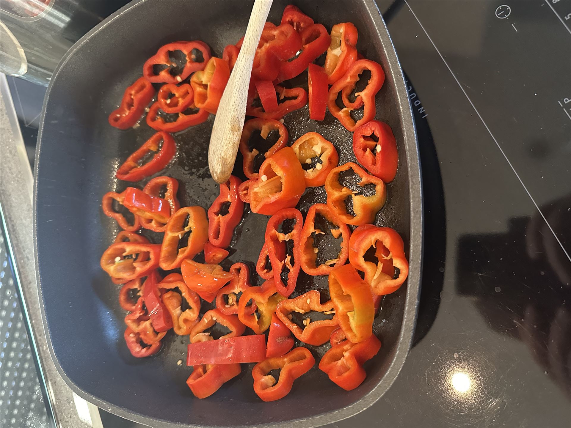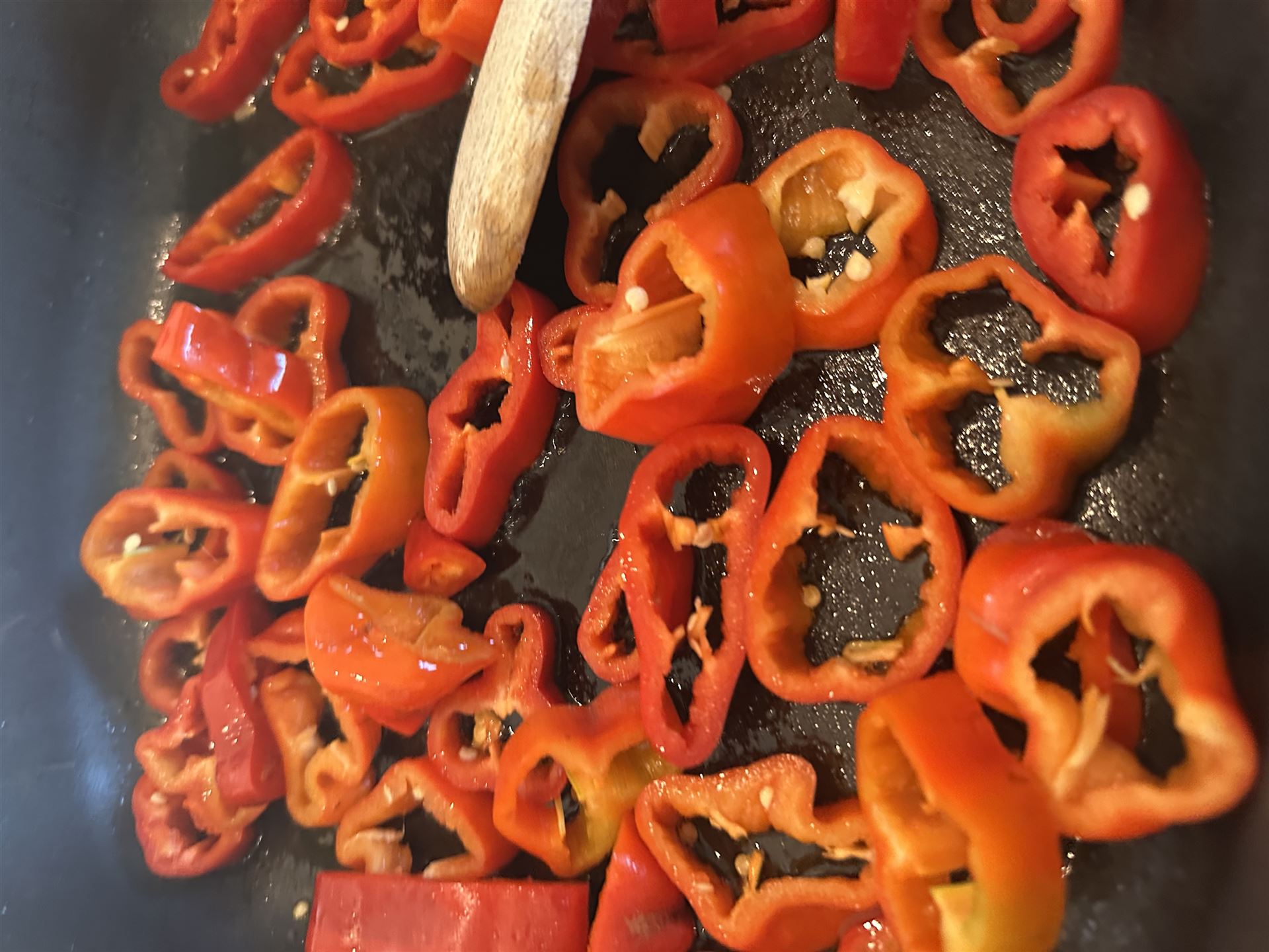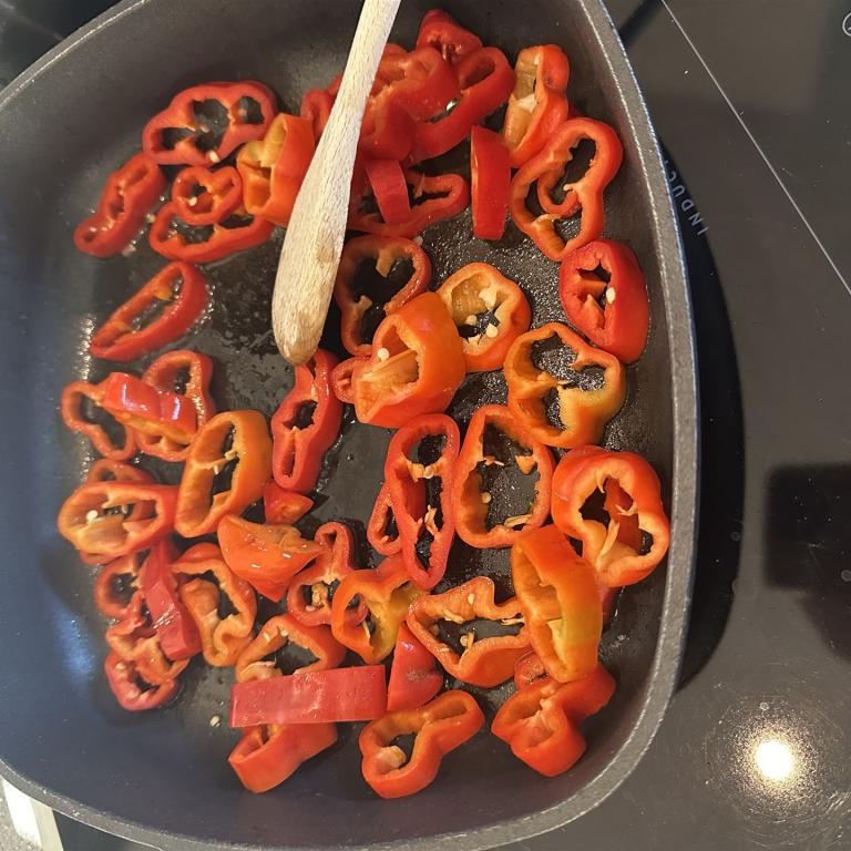 Zunächst die Spitzpaprika in ca. 0,5 bis 1 cm große Röllchen schneiden, weiße Innenteile entfernen.