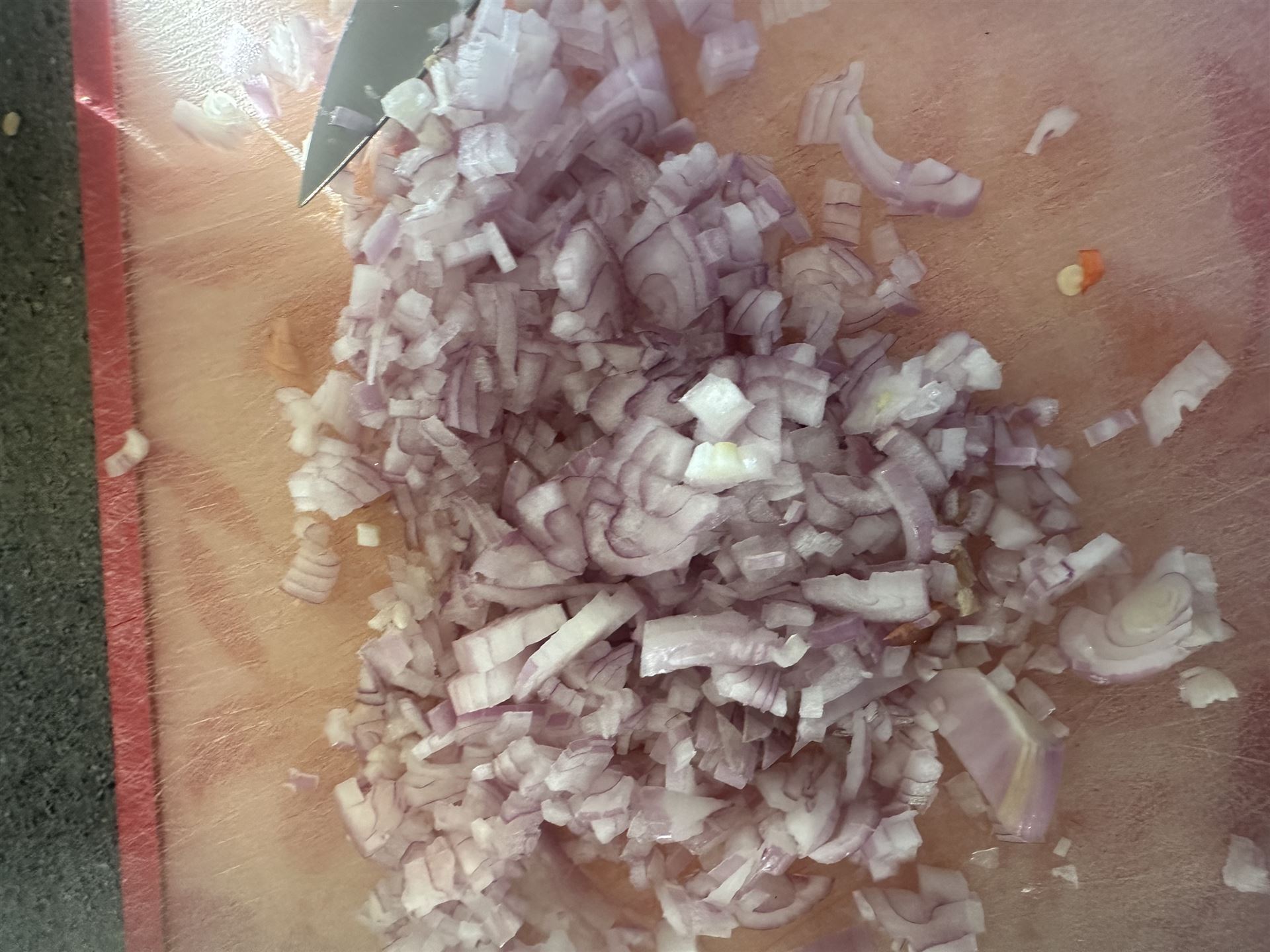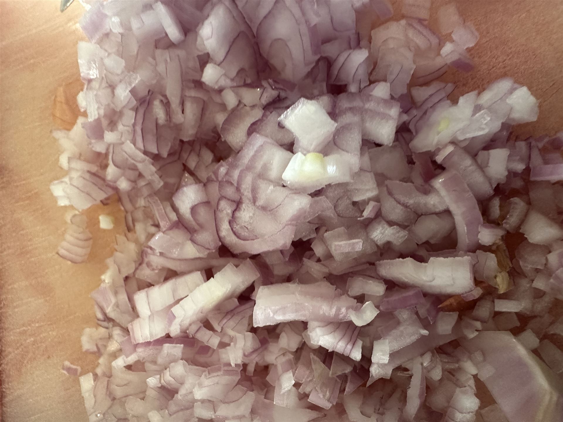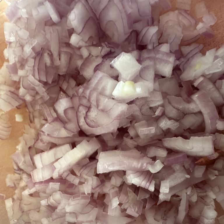 In der Zeit solltet Ihr die Zwiebeln klein würfeln.