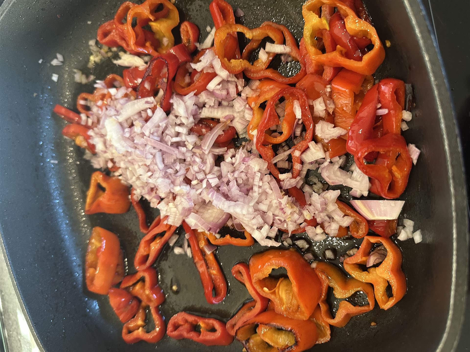 Nach der Schmorzeit die Spitzpaprika mit dem Balsamico ablöschen. Die Zwiebeln dazugeben, vermischen und mindestens weitere 10 Minuten köcheln! Zwischendurch immer wieder umrühren.