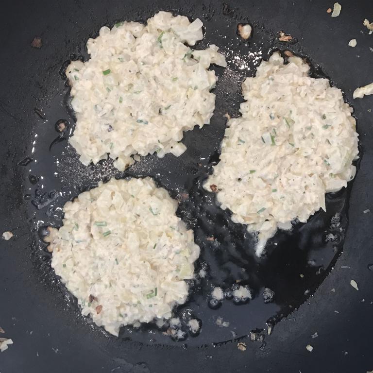 Das restliche Öl in einer Pfanne erhitzen und aus der Masse entweder acht Puffer backen oder in einer kleinen Pfanne zwei große Rösti braten.