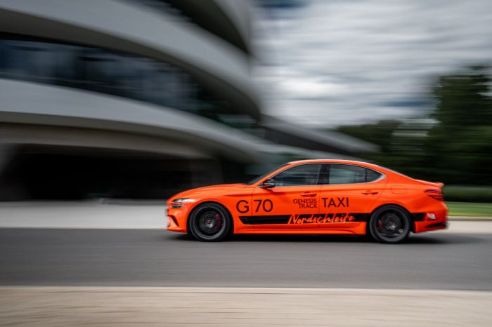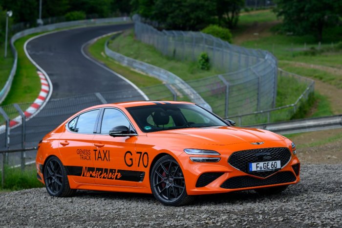 Für eine bessere Kühlung der Bremsen führen zusätzliche Luftkanäle im Frontstoßfänger zu den Radhäusern, während Hitzeschilde an den Getriebeöl-Leitungen ein Überhitzen des Getriebes beim Rennstreckeneinsatz verhindern. Im Rahmen einer dreijährigen Partnerschaft zwischen Genesis und Michelin wird das G70 Track Taxi mit Michelin Pilot Sport 4S Spezialreifen ausgestattet, die bei allen Wetterbedingungen eine herausragende Performance garantieren. Das G70 Track Taxi ist in der auffälligen, vom Genesis Magma Programm inspirierten orangefarbenen Außenlackierung gehalten und hebt sich damit deutlich vom dichten Grün ab, das die Nordschleife umgibt. Buchungen für das Genesis Track Taxi Nordschleife sind ab dem 21. Juni möglich, das Programm startet am 7. Juli. Pro Fahrt bieten sich dabei einzigartige Rennerlebnisse für bis zu drei Passagiere. Weitere Informationen unter: https://tracktaxi-nordschleife.genesis.com/