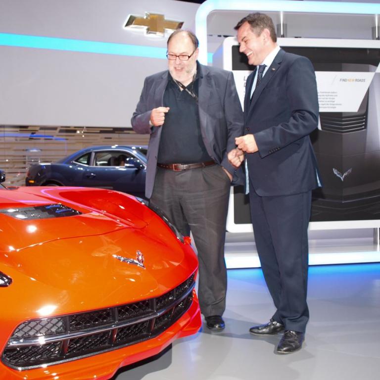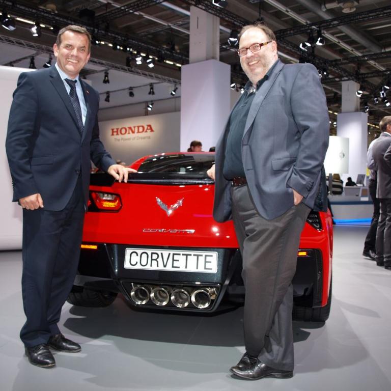 Chevrolet-Deutschland-Chef Steffen Raschig und Michael Weyland hinter einem automoblen Dampfhammer - der Corvette