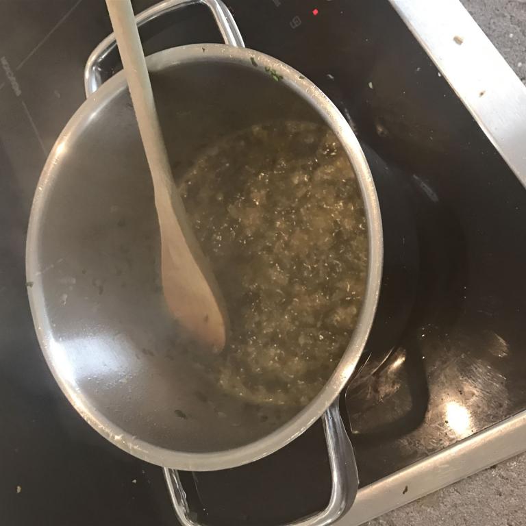 Danach habe ich in einem Topf etwas Butterschmalz zerlaufen lassen und den Chicorée dazu gegeben. Um sicherzustellen, dass mir nichts verbrennt, habe ich noch etwas Gemüsebrühe dazu gegeben. Nun muss man das Ganze einfach bei mittlerer Hitze so lange dünsten lassen, bis der Chicorée weich geworden ist.