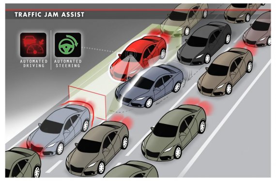 Bei Level eins und zwei - da muss auch noch der Fahrer eingreifen können, aber Level eins - ein Beispiel, was wir im Level eins haben ist das Start-Stopp-System. Das kennt jeder, das ist heute schon in fast jedem Fahrzeug drin. Dann kommt Level zwei, das sind dann Systeme wie der Stauassistent, da kann der Fahrer noch die Kontrolle übernehmen, aber das Fahrzeug hält selbstständig bis zum Full Stop und kann dann auch selbstständig wieder anfahren.