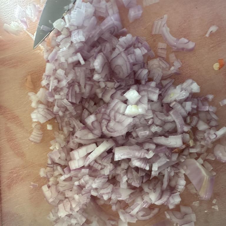 In der Zeit solltet Ihr die Zwiebeln klein würfeln.