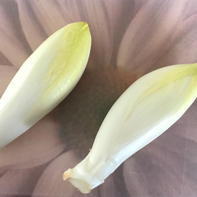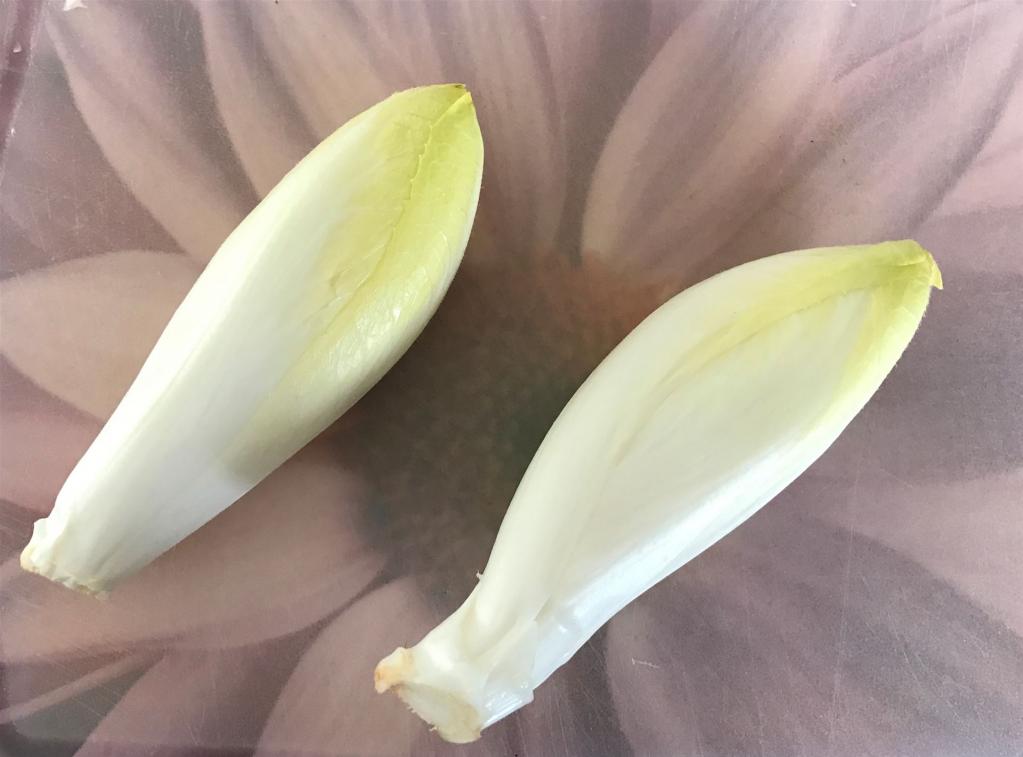 Die äußeren Blätter des Chicorée habe ich entfernt, gewaschen und den Strunk am Ende weggeschnitten. Dann habe ich den Chicorée jeweils halbiert und auch den inneren Teil des Strunks entfernt. Das ist deshalb wichtig, weil der Geschmack sonst leicht bitter werden kann.