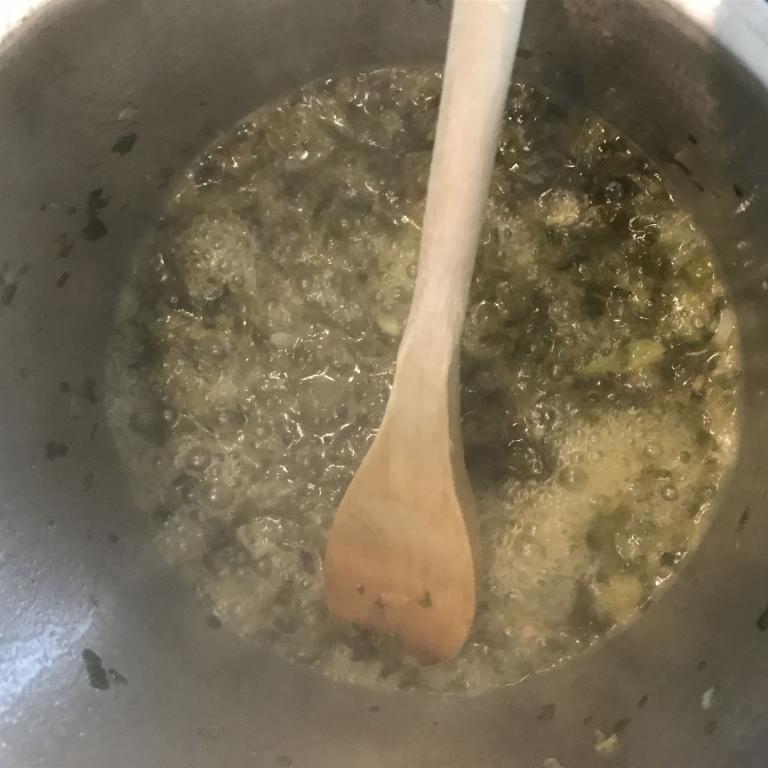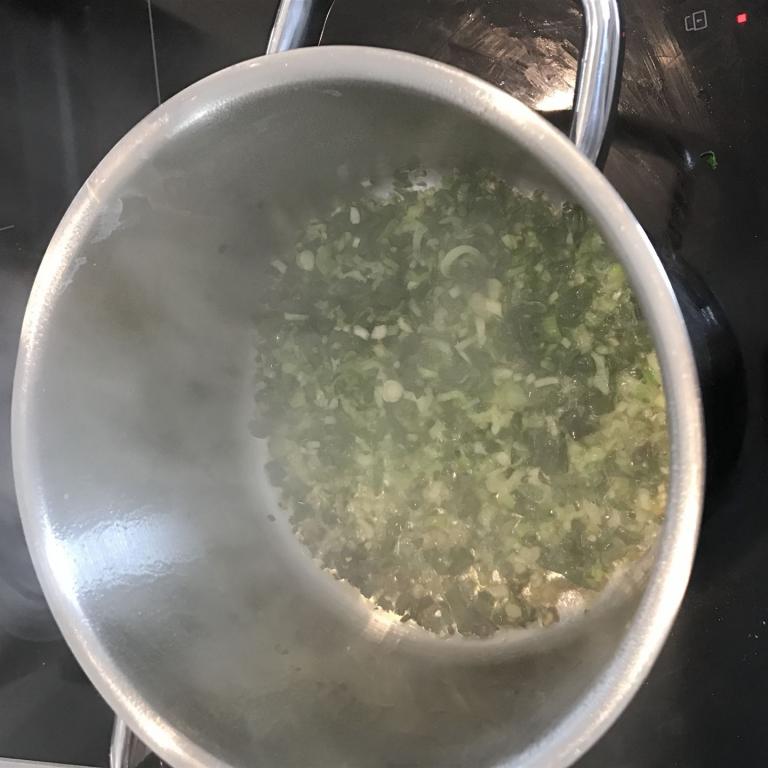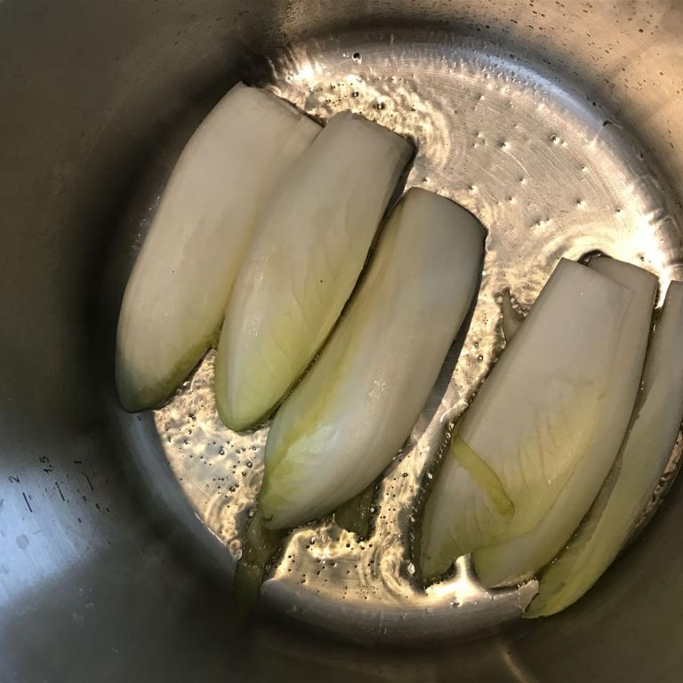 Danach habe ich in einem Topf etwas Butterschmalz zerlaufen lassen und den Chicorée dazu gegeben. Um sicherzustellen, dass mir nichts verbrennt, habe ich noch etwas Gemüsebrühe dazu gegeben. Nun muss man das Ganze einfach bei mittlerer Hitze so lange dünsten lassen, bis der Chicorée weich geworden ist.
