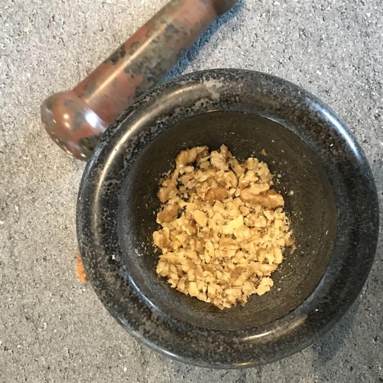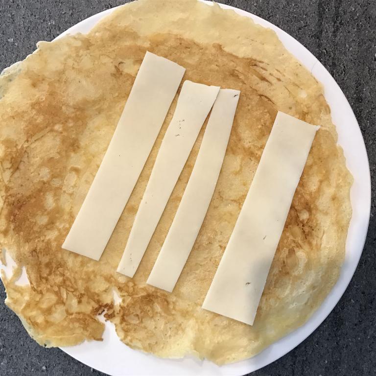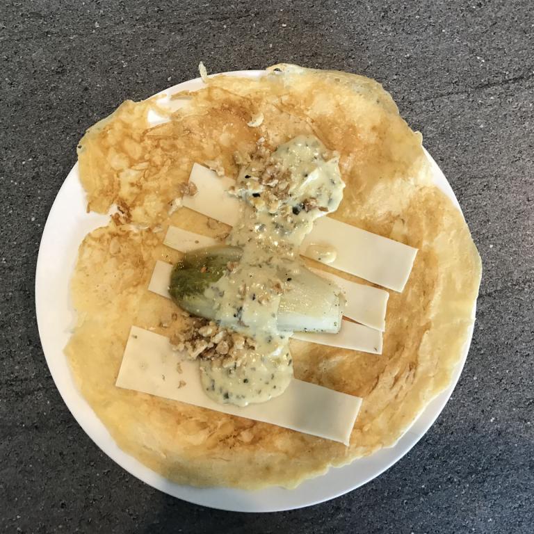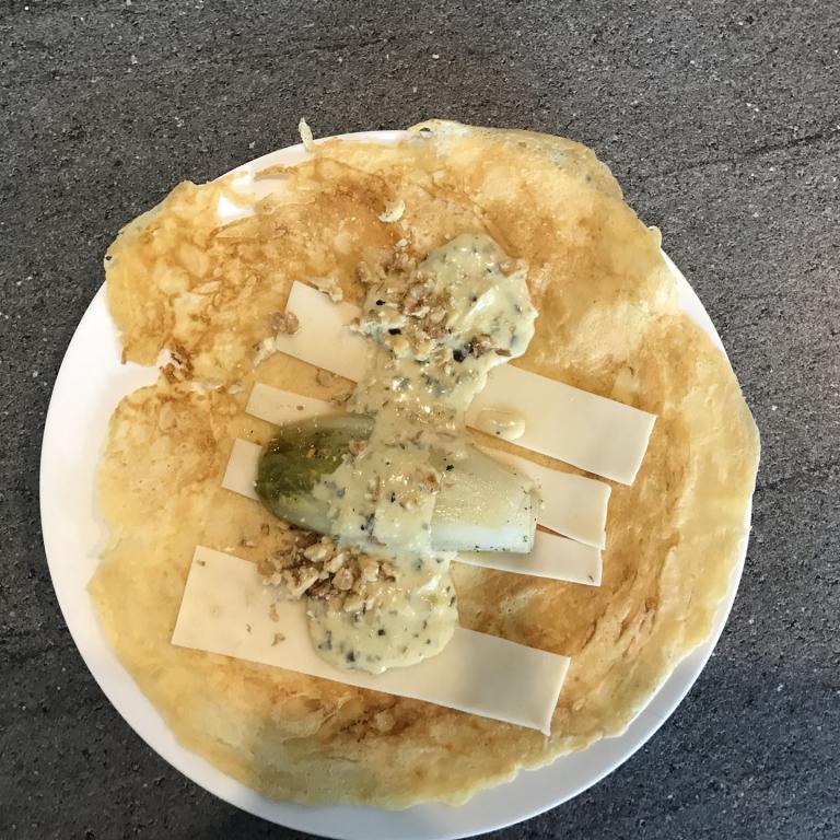 Jetzt schneiden wir einen Schnittkäse nach Wahl in Streifen und belegen ein Crêpe damit. Darauf legen wir nun – je nach Größe – eine oder zwei Chicoréehälften. Darüber verteilen wir nun die Roquefortsauce und bestreuen alles mit im Mörser zerkleinerte, Walnüssen.